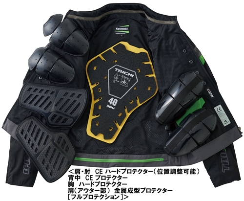 EVAソフトプロテクターを肩・肘・背中に標準装備、肘は外部脱着式